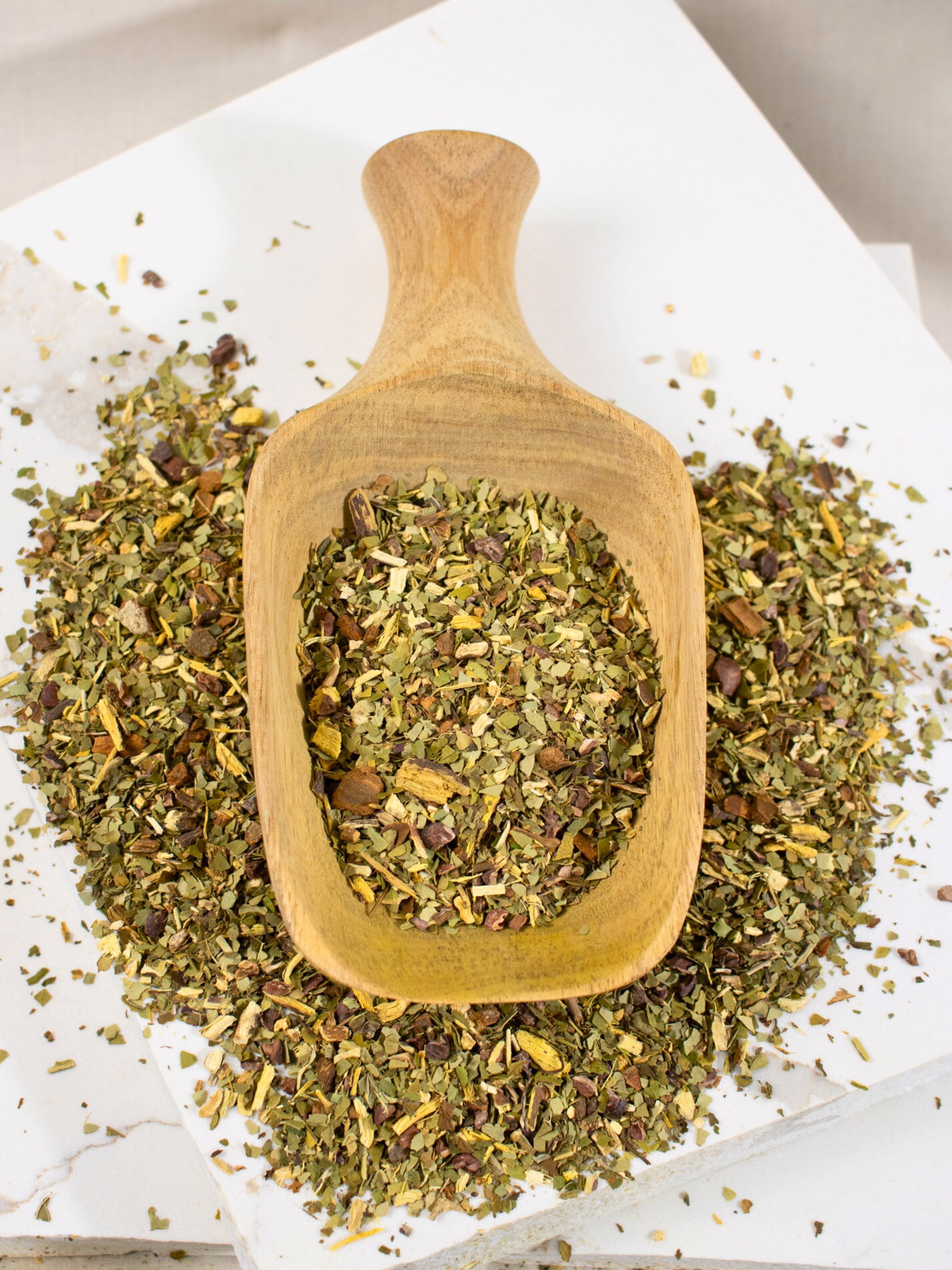Yerba Mate provides gentle, sustained energy, while cacao nibs offer a naturally rich, chocolatey flavor that supports mood and mental clarity.* Licorice root softens and balances the blend, complemented by warming cinnamon and ginger for added comfort. Dandelion root grounds the flavor and supports digestion, while peppermint leaf brings a clean, refreshing finish.*