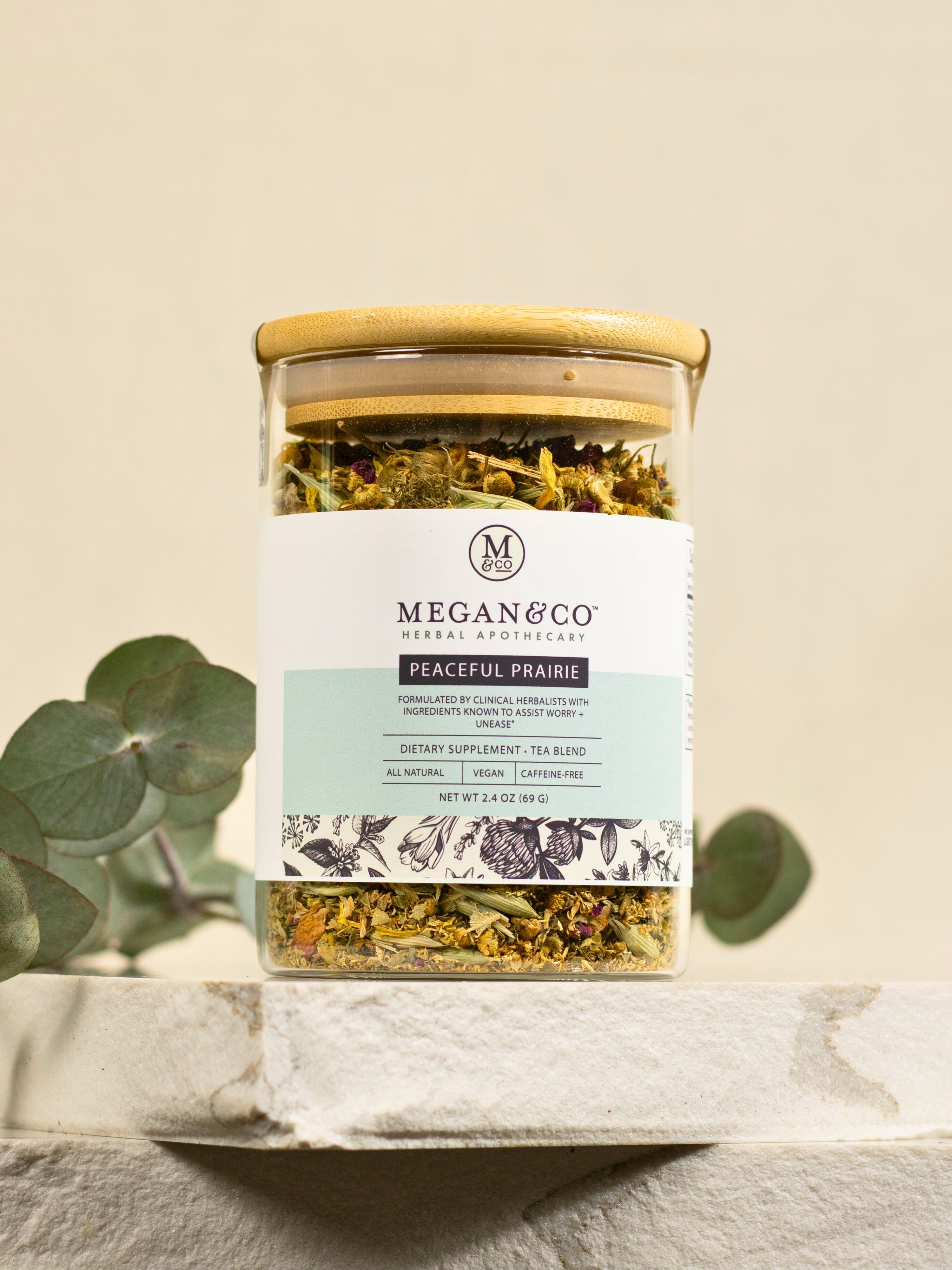 Peaceful Prairie tea blend is a thoughtfully crafted loose leaf herbal tea formulated by clinical herbalists to gently support the nervous system, promote a balanced mood, and nourish the limbic system.*