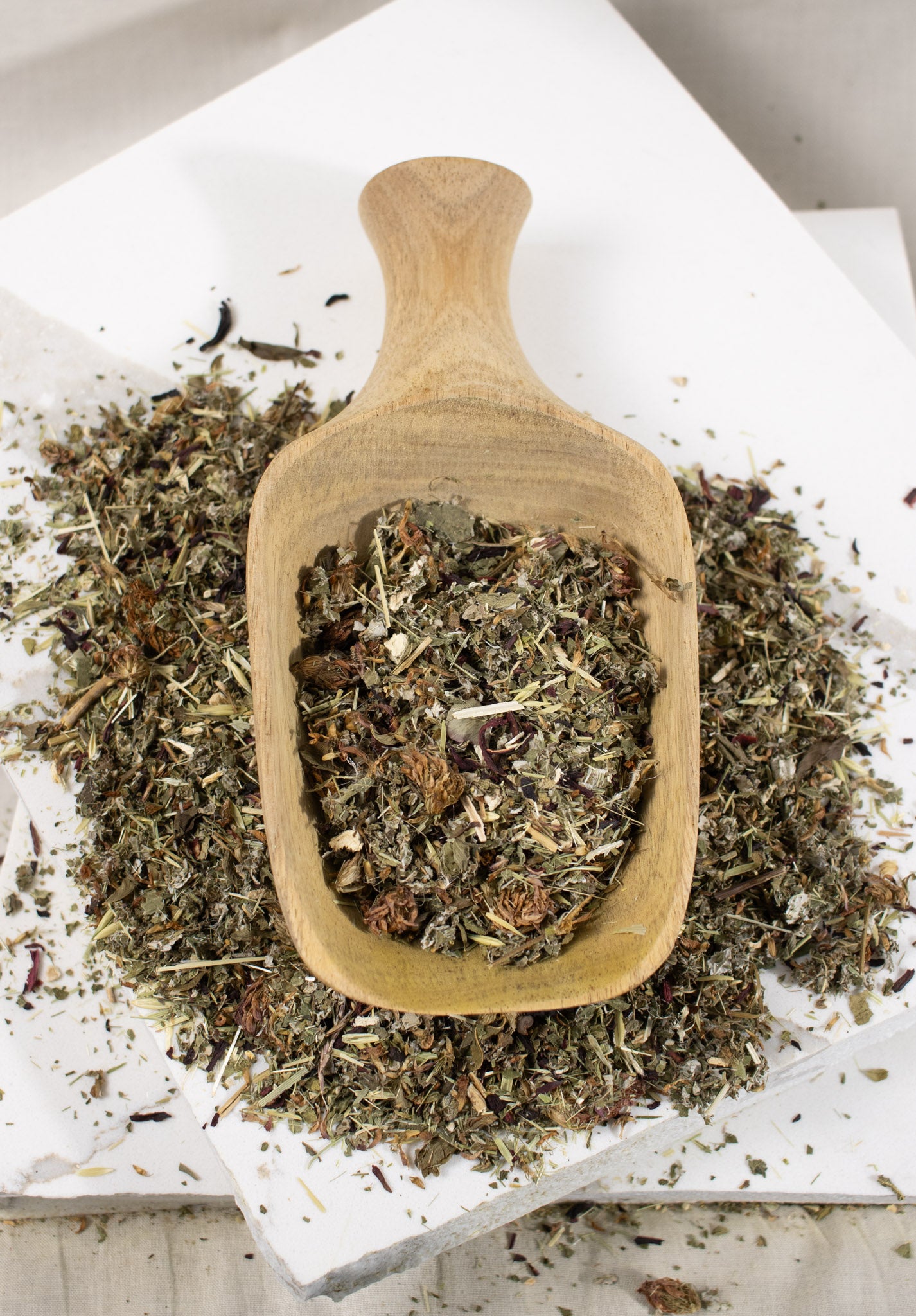 Raspberry Leaf and Red Clover help maintain natural hormonal harmony. Nettle and Oat Straw fortify the body with essential minerals that support energy, mood, and focus. Burdock and Hibiscus support gentle detoxification and promote a healthy skin tone, while Marshmallow Root soothes the digestive tract, fostering a calm, grounded feeling.*