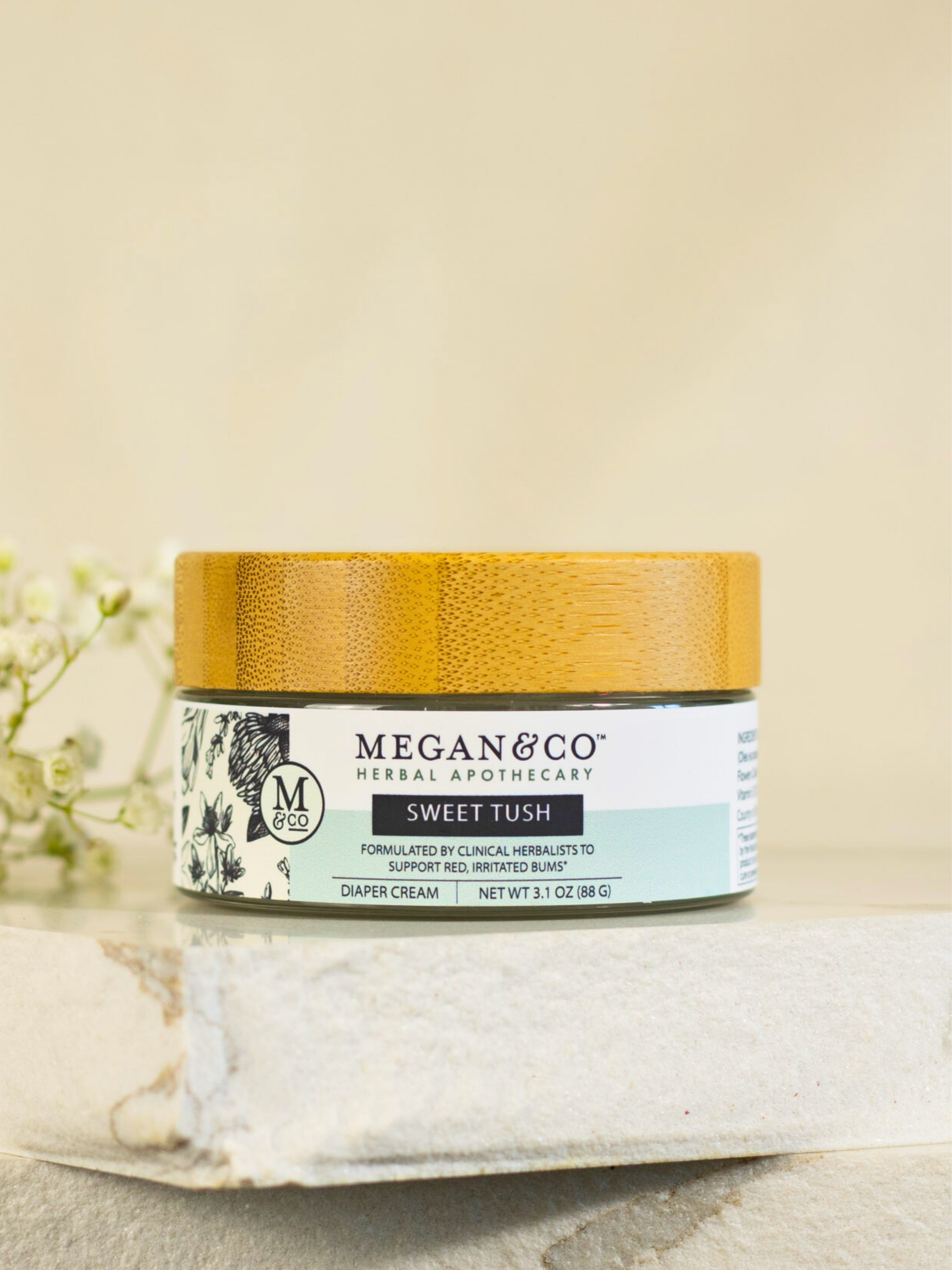 Sweet Tush Herbal Salve is a calming, unscented botanical salve thoughtfully formulated by Clinical Herbalists to support skin moisture, comfort, and resilience in the diaper area*.